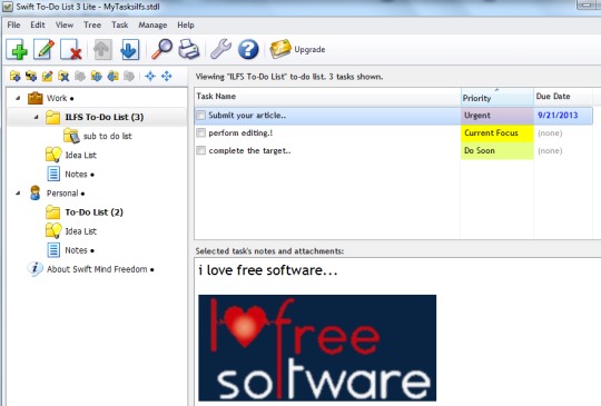 To work with this task management software, you can start with a new database or can use preset template (Swift Mind Freedom Template) in which all the to do lists and tasks will be added. In above screenshot, you can see main interface of Swift To-Do List Lite which is divided into three sections. These are: