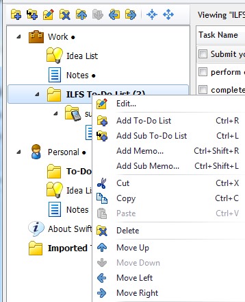 - To-Do List Tree: This section shows added to do list, sub to do list, and memo. A memo is a task independent note that is not attached with any task. You can edit, delete, rearrange (move up or down) any to do list, sub to do list, or a memo. Use plus button to add a to do list and right-click on a to do list to add sub to do list and memo.