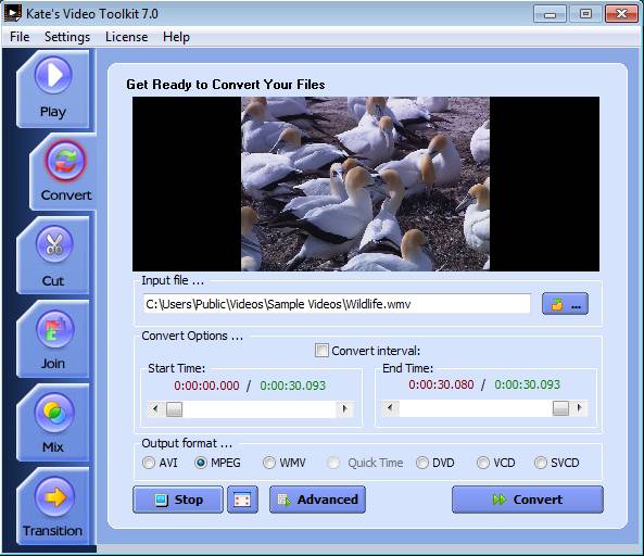 The only thing that you need to do in order to start the conversion is selecting the video, selecting the output video format down below, and hit convert. If you want, mark Convert Interval to convert only certain part of the video. Advance button will show you quality settings.