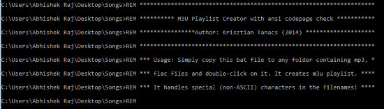 M3U Playlist Creator is a simple command line tool to create music playlists. It allows you to create an M3U playlist. Being a command line tool, it is very easy to use and you don’t have to type any complex commands to create a playlist file. You just have to download it from the link provided above and copy its batch file to any of your music folder. After that, run it and it will automatically create an M3U playlist with name “Playlist” in the folder it was executed.