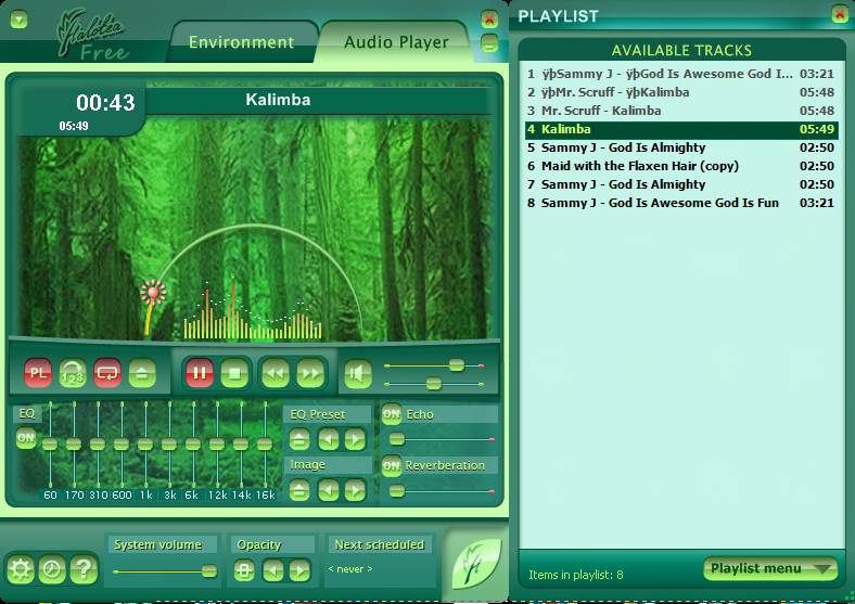 In the image above, we can see the default interface of this free audio software. At the top there are two tabs available. The one called Environment is where you will see a list of relaxing audio tracks in the left sidebar. They are called themes. Each theme consist of several sounds, an example combo would be wind, rain, bird chirping, and so on. With the help of Presets you can adjust which of those sounds are gonna be played in a certain theme. All the way at the bottom we have the controls menu, and on the right playlist where audio tracks loaded for the Audio Player tab can be seen.