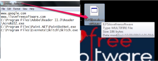 Above screenshot shows a text file saved as multifire extension that became an executable file. In the similar way, you can also create an executable file using MultiFire. Just by double-clicking on that file, all items will be launched. One of the important thing about MultiFire is that it doesn’t provide any kind of interface. Just Windows Notepad is needed to create an executable file to launch applications.