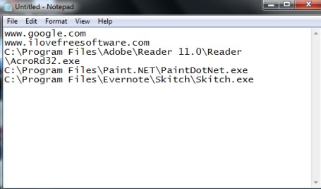 Step 3: Now simply open Windows Notepad and provide addresses of different files, folders, website URLs, and applications. Enter a single address in a single line. And do not leave any line blank otherwise at the time of execution, you will get an error.