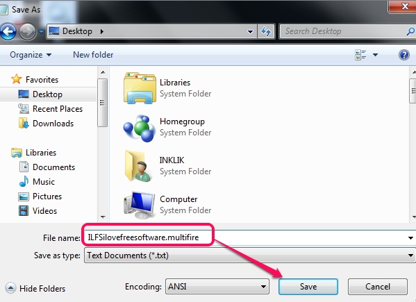 Step 4: Now you have to save this text file (not in *.txt format). Select any location where you want to save the executable file. Your desktop will be the most suitable location or you can select any other location. At the time of saving the file, give it any desired name, and add “.multifire” extension with its name. See the screenshot below: