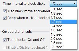 - The various time intervals to block clicks are: 0.1 sec, 1/8 sec, 1/4 sec, 1/2 sec, 3/4 sec, 1.0 sec, 1.5 sec, 2.0 sec, 2.5 sec, and 3.0 sec. This option is shown in below screenshot.