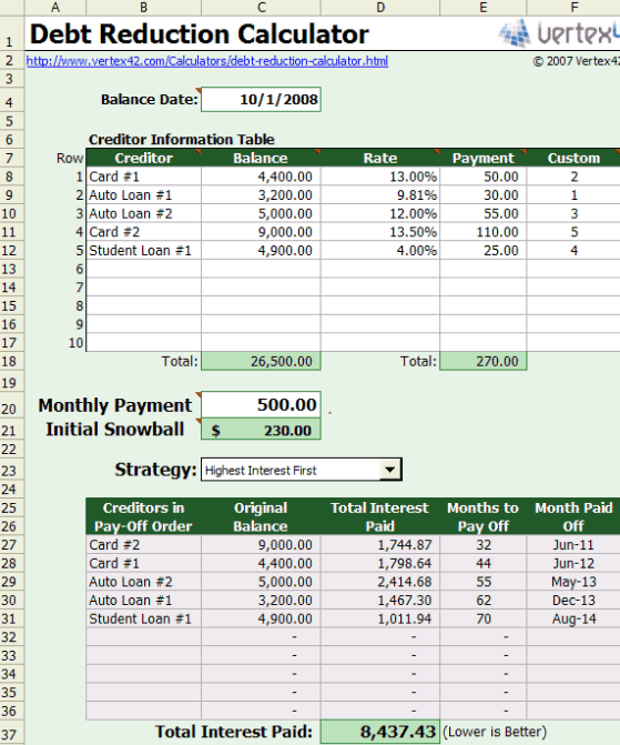 Vertex42 has an interesting free Excel based Debt reduction calculator. This excel lets you determine the best strategy to payoff all your debts, and calculate the exact payments to be paid, and which debt to be paid off first. This Excel based Debt Reduction Calculator is totally free. You do not need to install anything, and there is no macro to run.