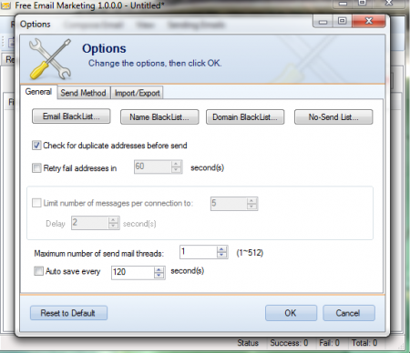 Then you have the Compose Email menu, here you can select the fields that you want in your mail and even load file as body text. If you want to make changes in the settings and want to access the options menu then click on view menu. Now click on options and you can start making appropriate changes. In the general tabs you can select which emails, domain names, or names you want to black list. Then you have the send method tab, here you can set the server through which you want to send or receive emails. In the import/export tab you can select whether you want to replace existing address, create new, etc.