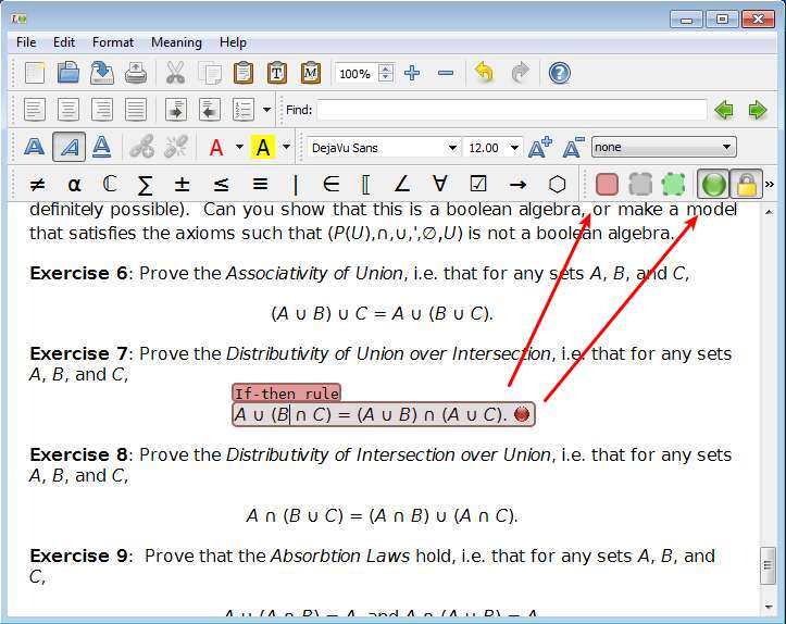 Before you can start checking if the math proofs and expressions that you’ve written are correct, you need to select them and then click on the green icon in the top right corner. This will tell Lurch that this isn’t just text and that it’s actually a math expression. Green icon where the arrow points is where you’ll turn on the checker. If there are problems, you should see a red indicator next to the expression that you’ve selected.