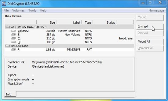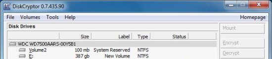 DiskCryptor is very easy to use. When you launch this free disk encryption software, it will list out all the internal disk partitions and external drives attached to your system, along with their size. You can select any disk you want to encrypt from here, and press the “Encrypt” button from the side panel. Be careful while selecting disk partition from the interface, since the partition you select won’t get highlighted and you may end up encrypting some other disk partition.