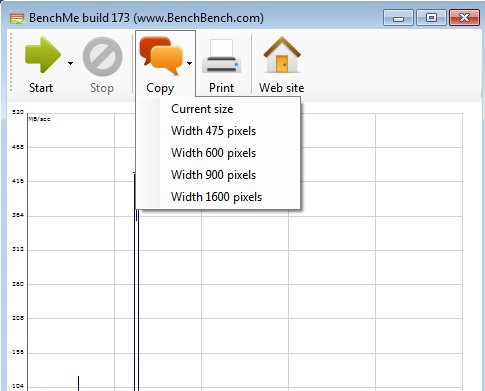 After you think you have good enough performance results you can stop the test by clicking on Stop (which comes up instead of Start in the toolbar at the top). Remember that the test runs continuously. Once that it’s stopped, Copy and Print options are gonna become available. Copy also has a drop down selection which allows you to choose how big the exported image of the performance diagram is gonna be.