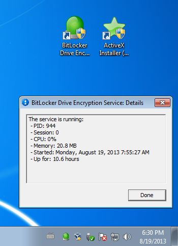 On the image down below you can see that we added 1 system tray icon and attached to it the BitLocker Encryption Service. Now that we have this icon active, in order to start the attached service (BitLocker) we just have to right click and select Start or do a left double click which also starts/stops the service.