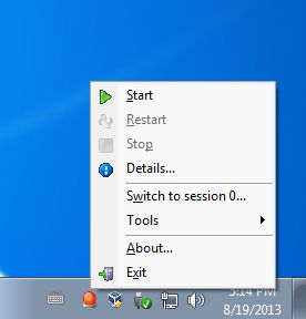 Here you can see that we created shortcuts to start system tray icons for 2 different services, but only 1 of them can be started at a time. Right click on the tray icon and select Start to start the service. Other tools are also available, like the service info tool that can be see on the image above.