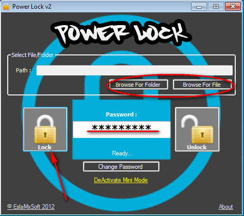 This is the default interface that waits for you after you start Power Lock. There is no installation, program runs right away and the way that password field starts blinking immediately asking for a password might confuse some. Similar file protection software usually asks for password in order to open up the main app, but how can you possibly know the password for Power Lock if this is the first time running the application. Don’t worry, the password that you’re asked here is not for program access it’s actually for file encryption, here’s how it works.