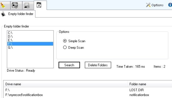 Last tab present in Sys Optimizer is Empty Folder Finder tab which lets you scan drives for empty folders (if present). You can either perform a simple scan or deep scan. But at the time of testing, I was not able to delete empty folders using Deep Scan. So simple scan will be more worthy to you if same problem will happen to you.