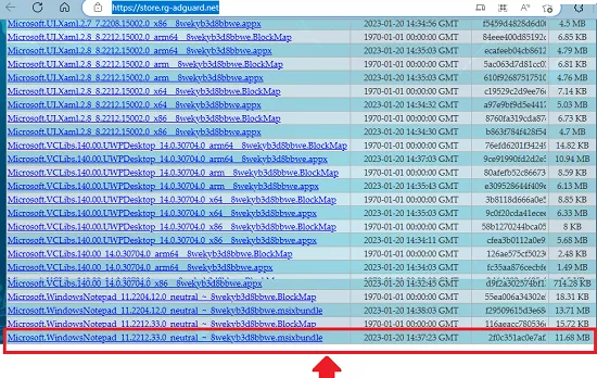 - It will load the Notepad app’s MSIXBUNDLE file. Scroll to the bottom and then download the “Microsoft.WindowsNotepad_11.2212.33.0_neutral_~_8wekyb3d8bbwe.msixbundle” file.