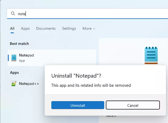 - Search for Notepad in Start and then right click on it to uninstall it.