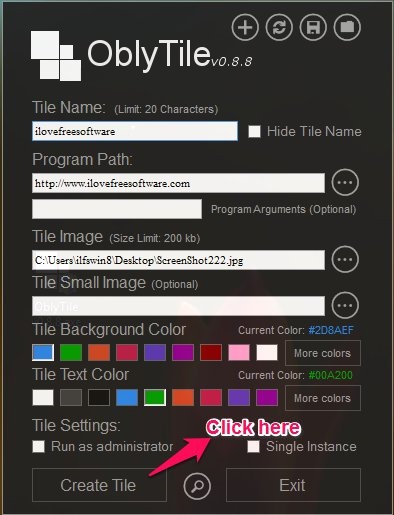 - Once you have selected files, folder, or a webpage; next thing that you have to do is choose an image which will show up as the tile of the program, file, folder, or webpage that you have selected. Then just select the background color and text color according to your taste and click on create tile as pointed out in the screenshot below. Now you will have the tile created as shown in the first screenshot of the post.