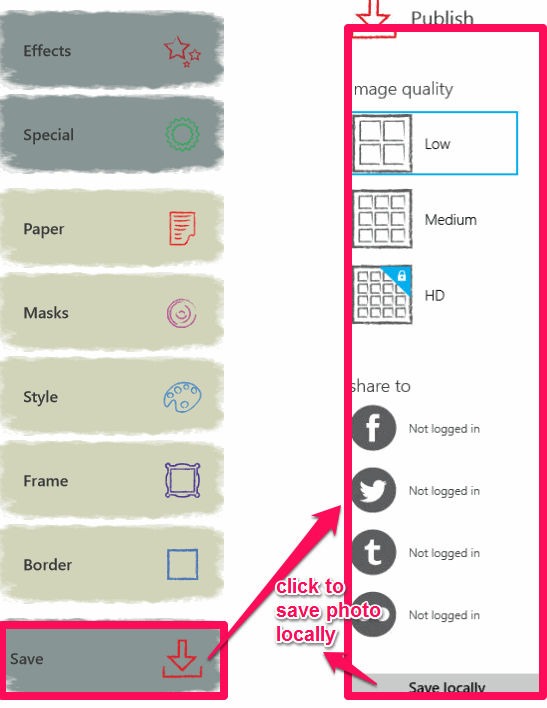 This app also provides some special effects to add extra pop to your photo. It has special effects like: Hand (to add sketching hand in your photo), Tornpaper, Masks, etc.. It also provides a wide range of different papers to set as background of your photo. You can even set any color as background paper from provided options. It lets you add different styles, frames, and Borders in your photo.