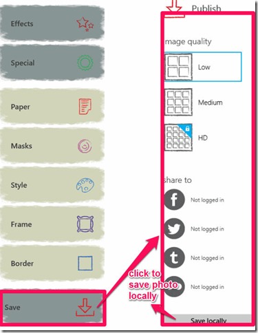 You can save your photo to your Windows 8 PC as well. It lets you save the photo in two different formats: JPG and PNG.