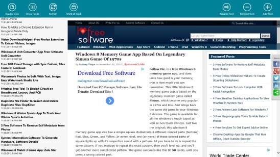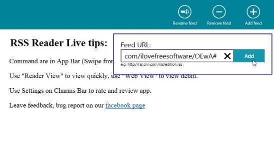 The app’s ease of use is what the makes the app handy. Adding and managing (renaming, deleting) feeds sources and then reading stories is very easy. All you have to do is right-click on screen. You’ll get a flyout at top containing: Web View/Reader View, Show Feeds, Refresh, Mark all read, Rename feed, Remove feed, and Add feed. Simply click on Add feed button, you’ll get a text box for entering the URL of the RSS feed source, Simply copy-paste a valid URL and click on ADD. This adds the source in the app’s database, and you’ll start getting feeds from that source.