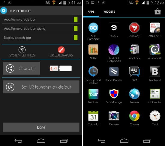 In the preferences of UR Launcher, you get the ability to add or remove the sidebar and sidebar sound. Also, you can enable or disable the search bar. The app drawer in UR Launcher for Android is pretty standard and looks and functions just like the stock Jellybean launcher’s app drawer.