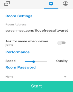 Step 6: Go to the app settings to personalize the sharing URL, enable the option to ask for the name when viewer joins, adjust speed & quality, and create new room password. You can create a custom and dynamic password or keep your room public.