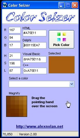 Color Seizer is another free color picker software using which you can pick colors from any part of the screen. When you pick a color, this free color picker software shows you the RGB values, HTML code values, visual basic code, HSL code, Delphi code, etc. This free color picker software is easy to use, as you just need to press the F8 key. Now, you need to move the pointing hand of this program to any part of the screen from where you want to pick the color. Color seizer even magnifies the part of the screen where you place the pointing hand, so you can easily pick the exact color.