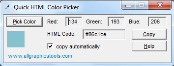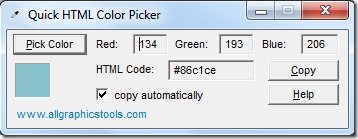 Quick HTML Color Picker is an easy to use free color picker software that helps you to pick or retrieve colors from the screen. The user-interface of this color picker software is very basic and clean and displays the HTML code for the color picked. In addition, it even shows you the RGB (Red, Green and Blue) values for the color that you have picked. For picking a color, you need to launch it and click the Pick Color button. It turns your mouse cursor into a dropper along with magnifying window which magnifies the part of the screen where you place the dropper. Now, left click the mouse to pick the color or else right-click the mouse to exit color picking. Download Quick HTML Color Picker for free.