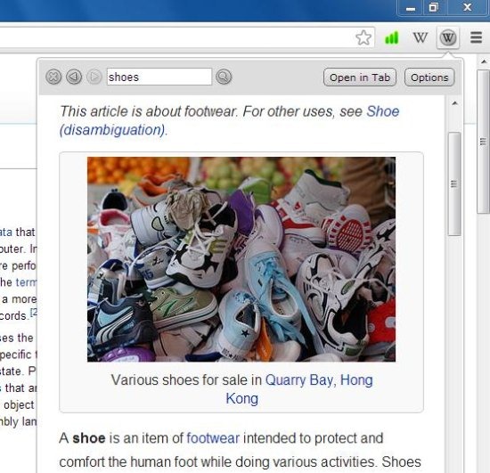 Wikipedia Search is a nice Chrome extension that ease the task of searching anything on Wikipedia, without having to leave the page you are working on. Wikipedia Search currently supports many languages, and you can choose your language preferences from the options page, which you can access through a right-click on the Wikipedia extension icon.
