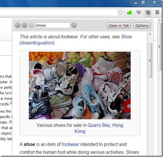 Lookup Companion For Wikipedia is a free Wikipedia extension for your Google Chrome browser which is like a mini Wikipedia browser, with history, cache, and quick-search features. It’s an amazing extension which makes your Wikipedia using experience more easier and convenient. When you add this extension to your Google Chrome browser, a small icon appears in front of your omnibar, which gives you access to the mini Wikipedia browser. When you click on this icon, a popup window appears which looks like a browser window, and works exactly like that, but only for Wikipedia. When you enter some text in the search bar, the article will be displayed right there in the mini browser window. You can search for anything like this and use the backward/forward arrows to navigate to the history pages. You can also open this Wikipedia Lookup in new tab.