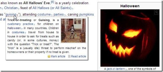 Wikipedia Quick Hints is another free Wikipedia extension for your Google Chrome browser that shows quick description of unknown terms in Wikipedia articles. It’s a fantastic extension, which makes reading Wikipedia articles easier and convenient for you. After adding the extension, you don’t need to separately open cross-linked Wikipedia pages to find meaning of unknown or difficult terms in your current Wikipedia article. All you need to do is to just mouse hover on the text which has been linked with another Wikipedia article, and a short description about that text will be displayed in a popup on the same web page, with a relevant descriptive image. To read the full article, you can click on the link at the bottom of the popup window. The article will be opened in a separate tab.