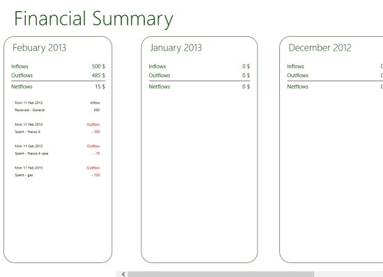 The interface of the app consists of the current month that is shown on the left side of the app window while the other months are listed on the right of the app window and they are horizontally scrollable. There are other ways to navigate if you get bored of scrolling through the app. If you do not like complicated expense managers and would prefer a simple one that showed you all your expenses on a monthly bases then try out My Wallet Pro for Windows 8.