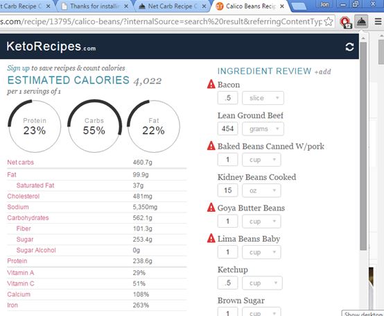 Just click on the top right corner Net Carb Recipe Calculator icon and it will scan the web page for recipe ingredients. It will then give a detailed analysis of how much calories each ingredient is equivalent to and a break down of the meal from the recipes into the three main groups of nutrients, proteins, carbohydrates and fats. The overall calorie count is also given, see image above.