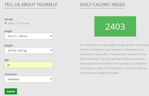 Once you’ve done that and clicked on the “Submit” button your daily caloric needs are going to be generated on the right. Simple and to the point.