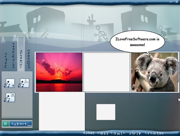 Menu for selecting what aspect of the comic book you want changed can be seen in the lower left corner. Menu has only four options. They are “Frames”, “Background”, “Clip art” and “Balloons”. Comic strip with its panels on the right blends in with the menus. Text located in the thought bubbles can be customized (font type, size, style). To arrange the tile simply left click and drag it to wherever it is that you need it to be. All the common image formats are supported JPEG, PNG, BMP, GIF, you name it, for both use in comics and during export. When you’re finished setting everything up, just left click on the “Export” button to save the comic and share it with the world.