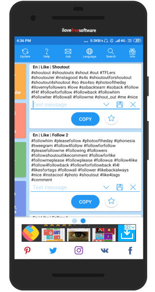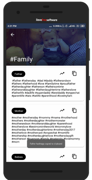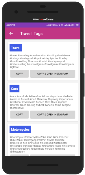 The app has a popular category that contains hashtags for different occasions such as fashion, country, family and many more. You can tap any category and copy the hashtags to use for the Instagram account.