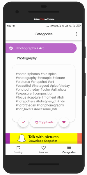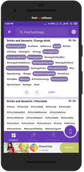 It is quite easy to use this app for hashtags. You just need to find the relevant category and tap on that. Each category consists of subcategories. You can find around 25 hashtags which you can copy and directly post on Instagram.