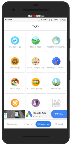The app has more than 15 categories that have hashtags for family, mood, art, fashion, social, etc. Using this app, you can search tags in the search bar or use hashtags from categories. You can save the hashtags so that you can use them for the next time you upload something on Instagram.