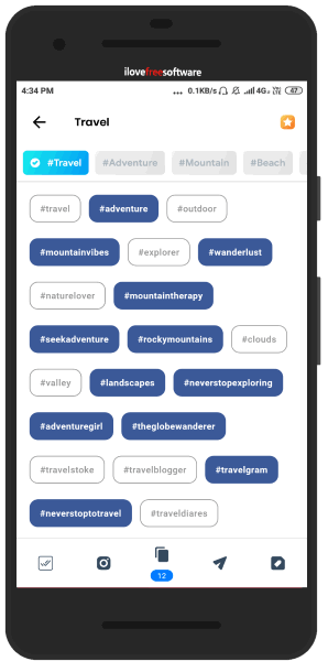 Once you tap on a category, it will show you colorful hashtags. You can remove any particular tag from the list. Then, you can copy the hashtags and directly share the hashtags on Instagram.