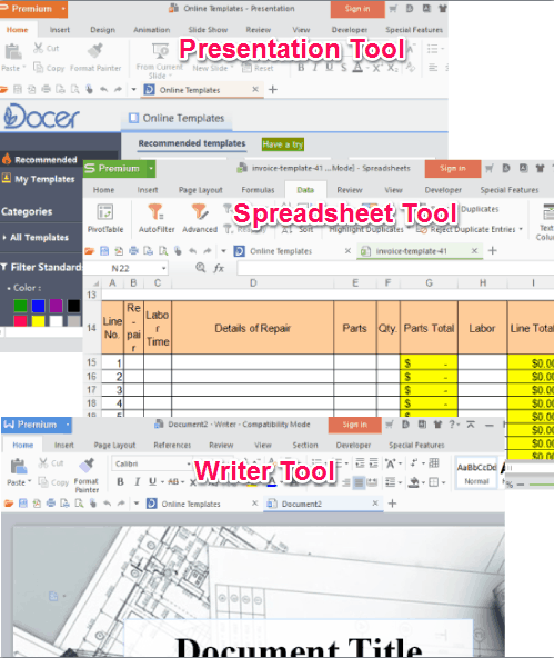 For each individual tool, it lets you download templates, or you can start with a blank template. All the tools have the interface similar to MS Word, Excel, and PowerPoint. There is a ribbon menu, different tabs with multiple options, and a drop-down icon to access File Edit, Insert, Tools, etc.