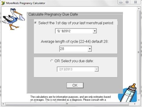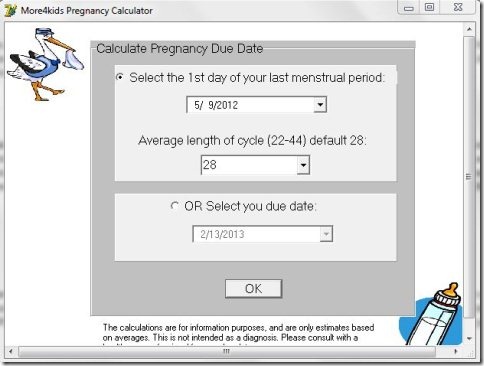 More4Kids Pregnancy Calculator is another free pregnancy calculating software that lets you calculate your due date and helps you to keep a track of all the changes taking place in your baby. To get started, you need to enter the first day of your last period in the respective box from the calendar and you are also required to enter the Average length of the cycle. After you enter these information, in no time it takes you to a new window which shows you the expected due date and expected days left in the due date. Within this window, it even shows you the information on monthly changes taking place in your baby within the 9 months of pregnancy.