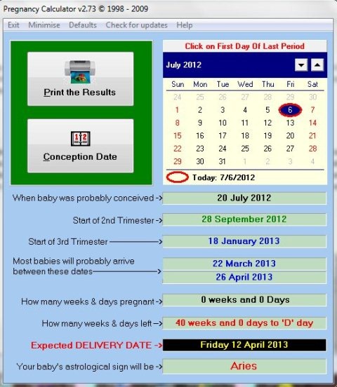 Pregnancy Calculator, as the name itself suggests that this is a free software to calculate pregnancy and show you the progress. This is a simple software that functions straightforwardly and shows you the expected delivery date in no time. Pregnancy calculator works when you choose the first day of last period from the calendar on the interface. Using that date it calculates and shows you the start date of 1st Trimester, start date of the 2nd Trimester, start date of the third Trimester, dates on which most of the babies arrive, shows the number of weeks and days you are pregnant from the date entered. It even shows you the weeks and days left for due date. As I mentioned earlier that it even shows you the expected delivery date and astrological sign. The best part is that, it even allows you to print the results and share it with your loved ones.