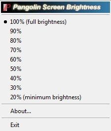 PangoBright is another free brightness adjusting software using which you can control screen brightness from your system tray. Like Desktop Lighter, this freeware also works from your system tray. For using PangoBright, you need to simply click the system tray icon, and you will come across the brightness menu which displays brightness levels from 20% to 100%. So you can choose the preferred brightness level with ease. The interface is very basic and lets you easily control screen brightness.