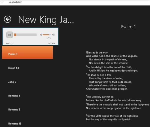 Audio Bible is a nice app to hear selected passages from the Bible. When you launch this app you will see an interface like the one shown in the screenshot above. All the versions of the Bible available are listed in tile format on the home page. There are a total of eight full books including Proverbs, John, Romans, James, etc. When you click on a book tile, it will open up the selected passage, as can be seen in the screenshot below.