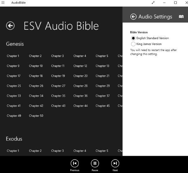 When you click on a chapter, the audio playback will start immediately. You can easily switch to next or previous chapter if you want. From the audio settings option you can choose the English Standard Version or the King James Version. You will be required to restart the app in case you make changes to the audio settings. The narrating voice is easily understandable. You can also play or pause the audio while listening. The audio can play in the background while you do other work related things on your computer.