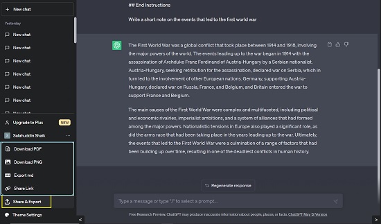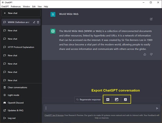 Click the link below to download the application from the GitHub repository and install it in your computer. Login to you Open AI ChatGPT account, and type the required text prompt. You will see 3 buttons adjacent to ‘Regenerate Response’. You can choose any format button to download a conversation.