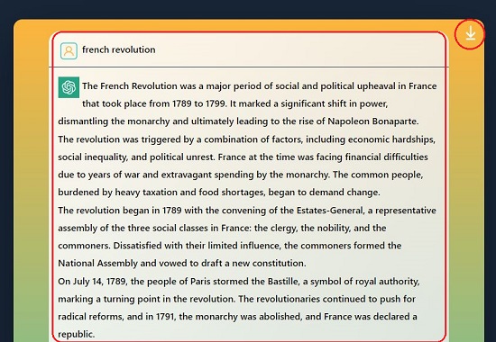 Your chat session will now be displayed in a neat, organized, and colorful format in another tab in your browser. To download your chat in the PNG format, click on the download icon at the top right of the chat.