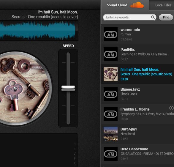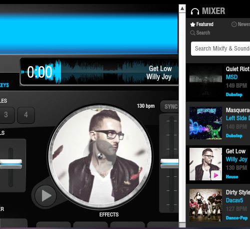 One of the two turntables that you get with Mixify can be seen on the image above. Songs are “dragged and dropped” from the list of available tracks on Soundcloud or Mixify. Song there can be searched by name using the search too at the top of the right sidebar list.