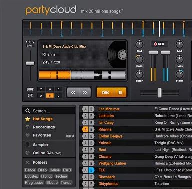This is PartyCloud. As you might have guessed it from its name, PartyCloud allows you to load up up to two songs from the 20 million or so large library of songs which is available on Soundcloud. Available mixing tools include beatsync, scratching, loops and various other effects.