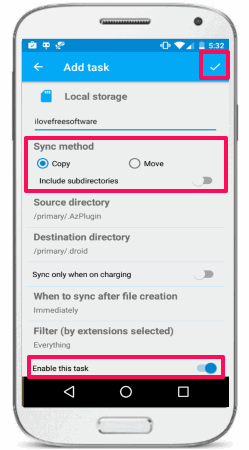 It’s pretty easy to keep two folders in sync using BFileSync app. To use it, first install it on your phone using the above link and then launch it. The main page of the app is empty as there are no tasks available. So, first add a task using the plus icon from the top of its interface. After that, a new page will pop up where you have to configure various parameters such as, sync method, source folder, destination folder, filters, when to sync the files, sync while charging, etc options. You can also define some file extensions as filters to instruct the app to only sync the specified type of files. But, creating the filters in the app is not very straight forward, you’ll have to create them, explicitly, see the complete guide here. After all set, enable the task using the switch given at the bottom of the page and finally tap on the check icon from the top to save the changes. From now on, the folders that you have specified will remain in sync.